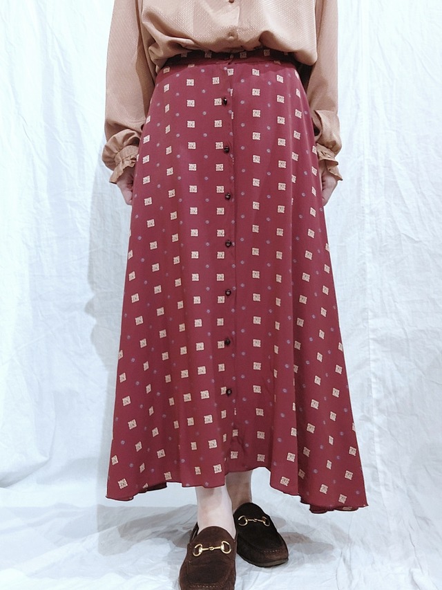 イタリア製の小紋柄スカートです。 サーキュラー型でフロントはボタンで留まっています。裏地付き。 Made in Italy 素材:表記無し(おそらくポリエステル) カラー:Wine red 実寸サイズ:ウエスト68㎝×着丈76㎝ *商品によって、多少の誤差が生じる事があります。何卒ご了承下さい。 状態:汚れやダメージ無く良い状態です。 【備考】 *ご購入前に【特定商取引法に基づく表記】を必ずご確認頂きますようお願い致します。 used商品について、通販をされるにあたっての注意事項の記載がございます。 *撮影環境や、ご使用のモニターにより実物と多少の色味の誤差が生じる場合がございますので予め、ご了承くださいますようお願い致します。 *その他、分かり辛い点、ご不明な点などがあるかと思います。 少しでも気になられることがございましたら、追加画像を送らせて頂くなど 個別に対応させて頂きますので【CONTACT】よりお気軽にお問い合わせ下さいませ。