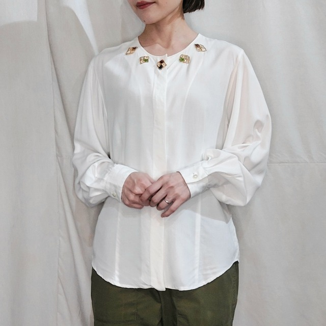 Bead embroidery no collar blouse / Made in Italy[m-1206]イタリア製 ビーズ刺繍ノーカラーブラウス