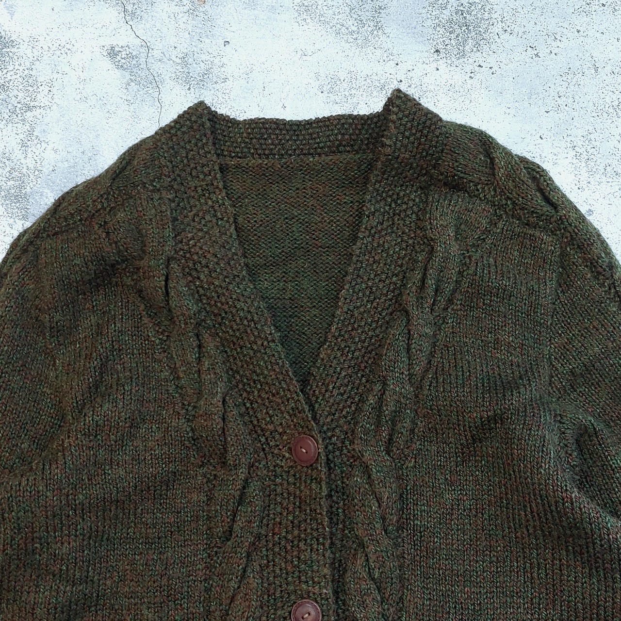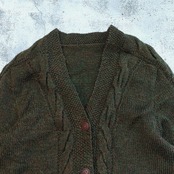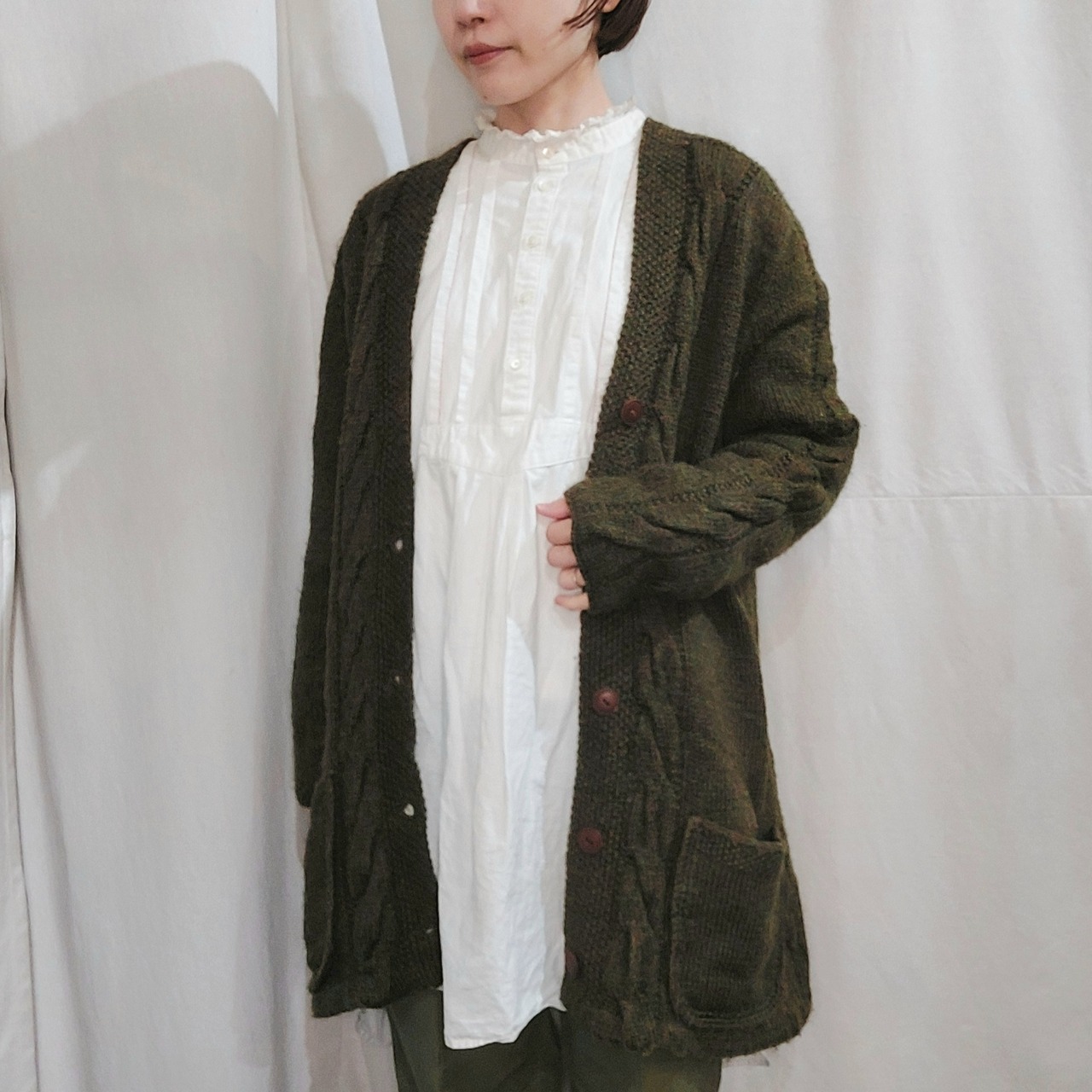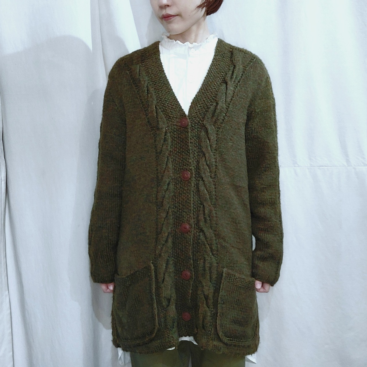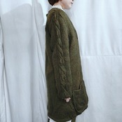 カーキとブラウンのミックスカラーの糸で編まれたロングニットカーディガンです。