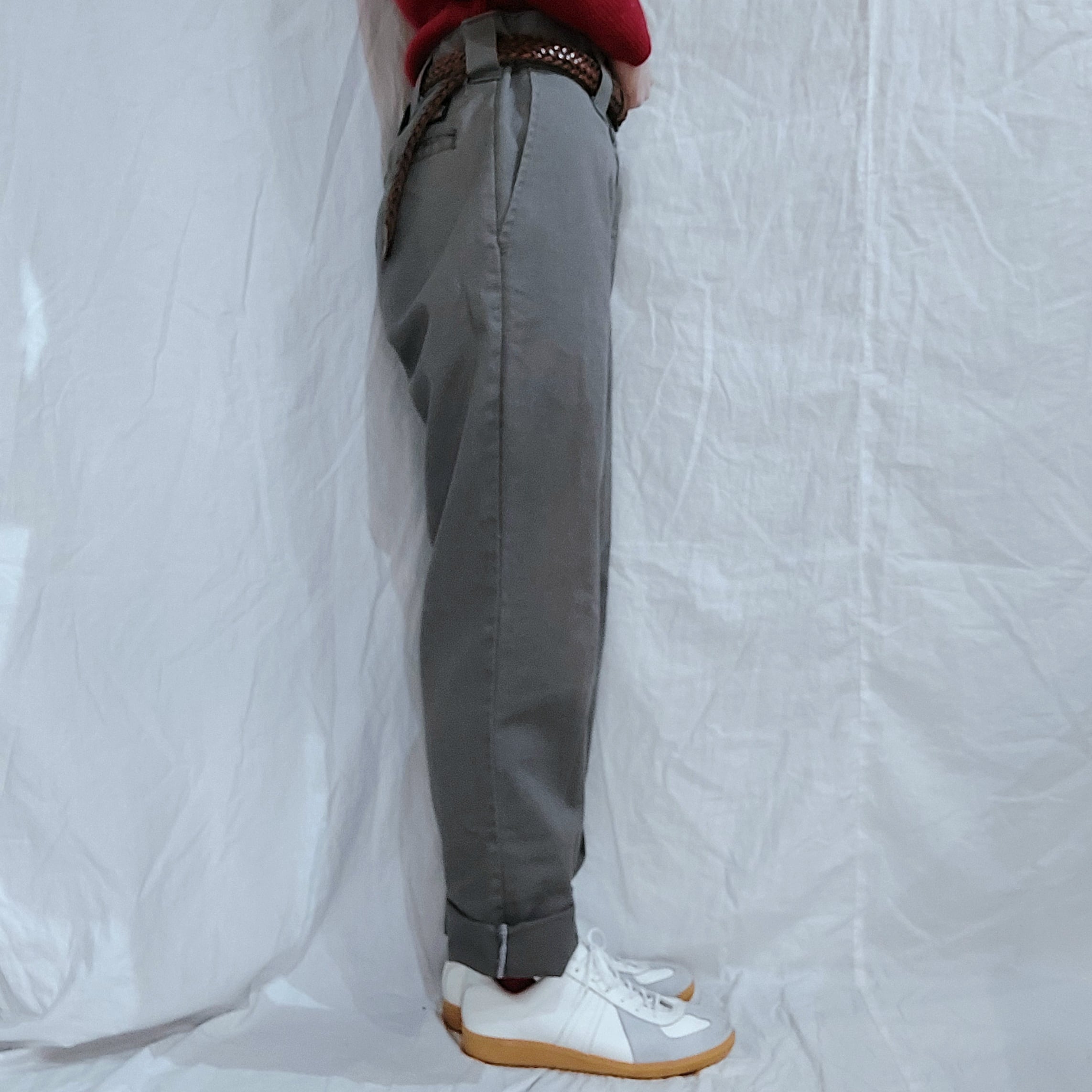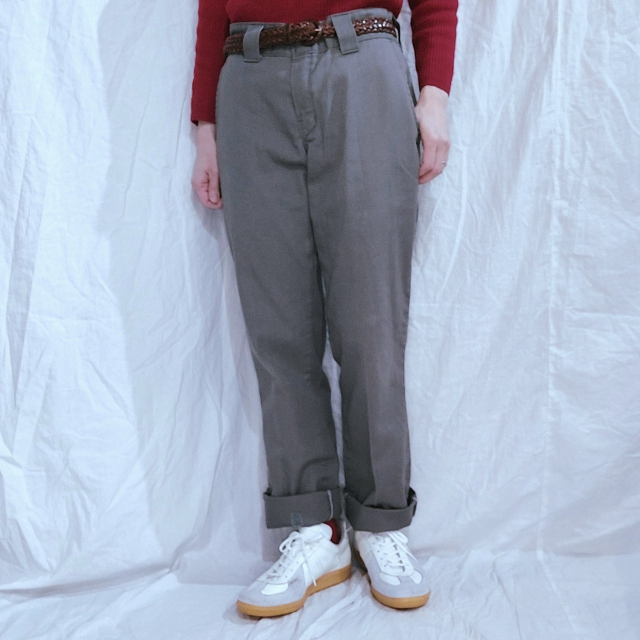 状態:2ヵ所小さな汚れがあります。センタープレス部分が白くなっています。右足裾付近にリペア跡があります。