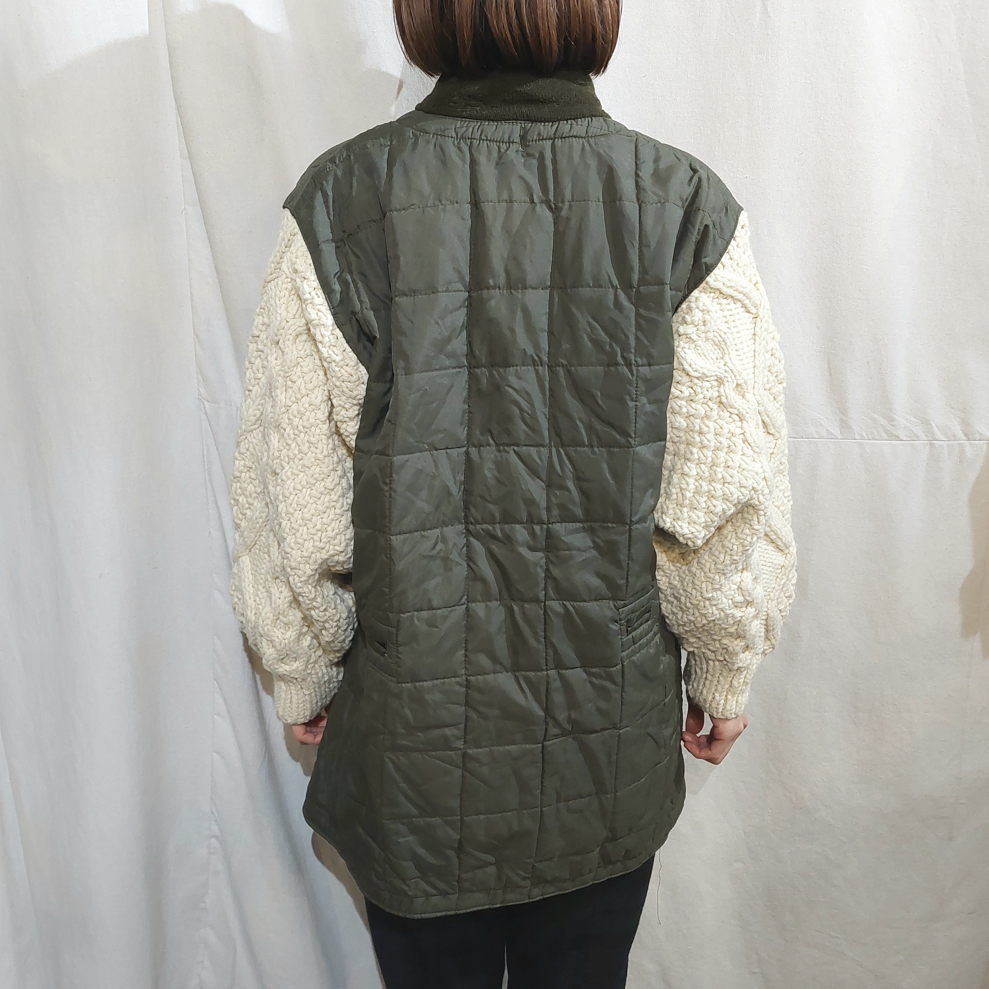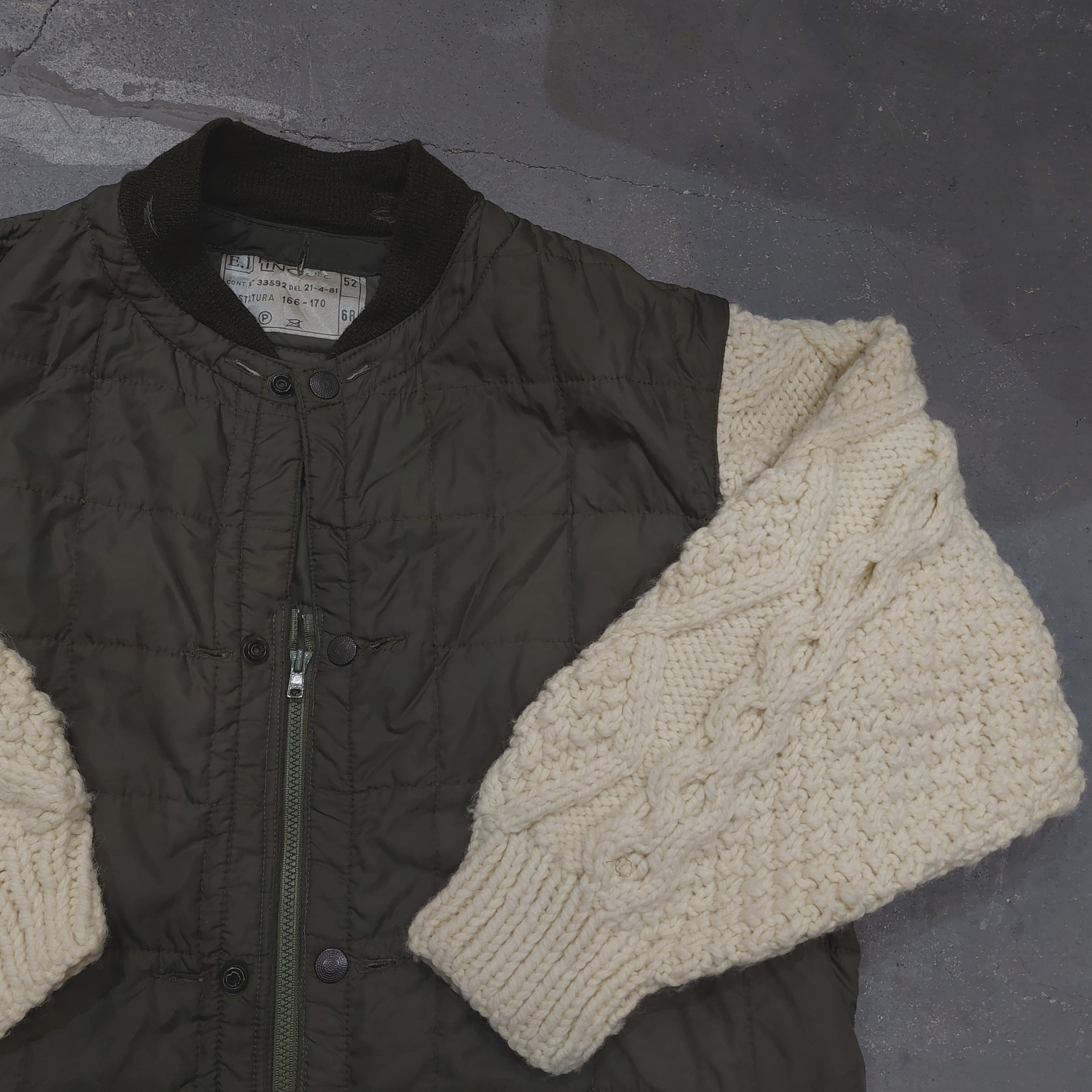 イタリア軍のキルティングライナーにアランニットの袖とファスナー、ポケットを付けました。