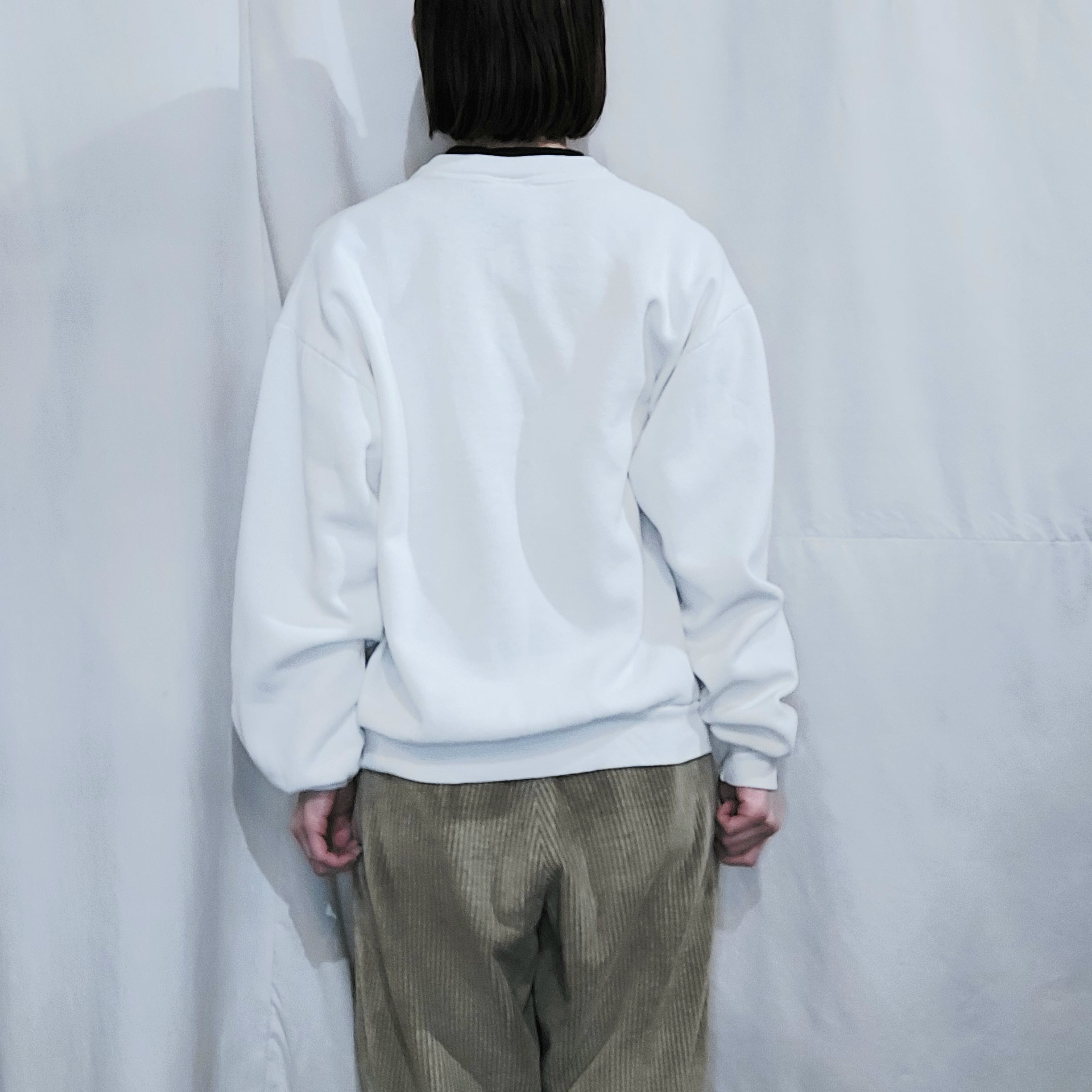 状態:所々に薄いシミや汚れがあります。プリントがひび割れています。後ろ首下付近の生地が少し薄くなっています。