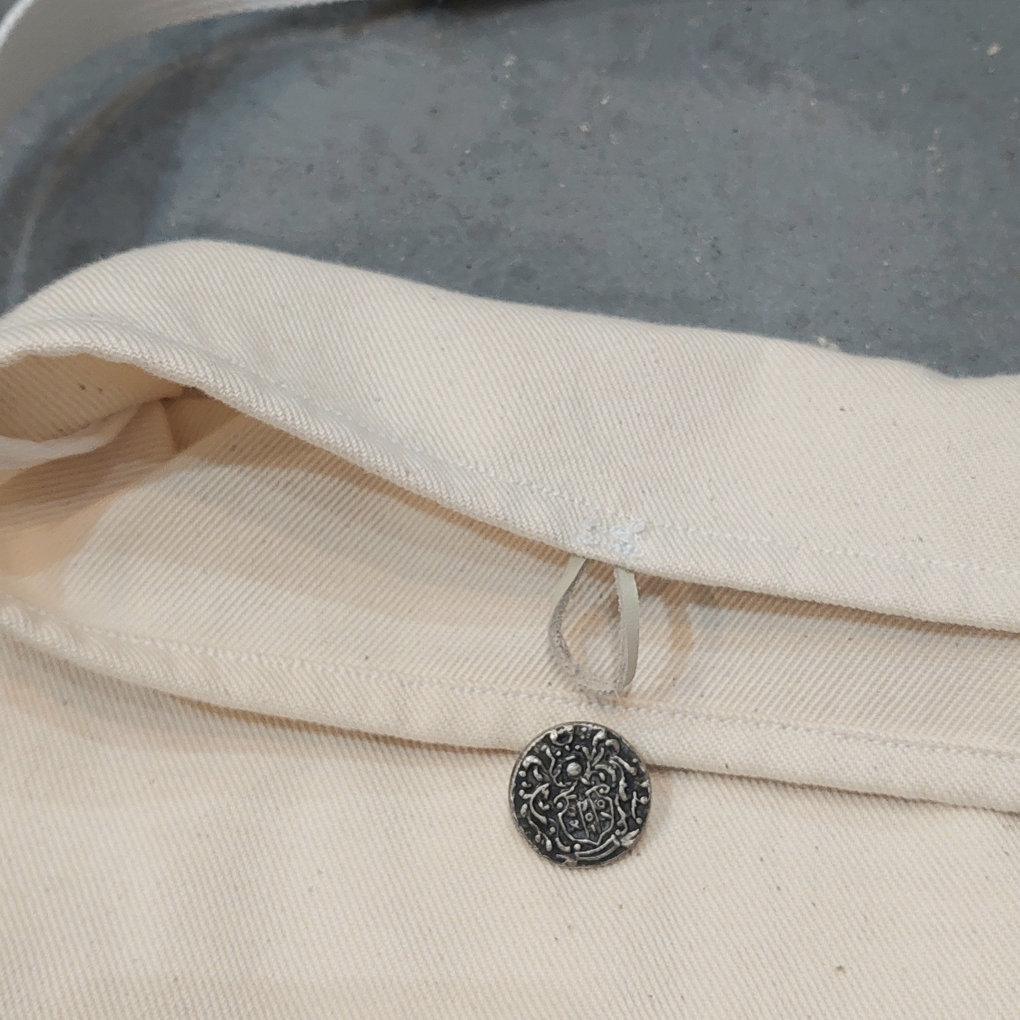 革紐のループをメタルボタンに引っ掛けて留める仕様です。