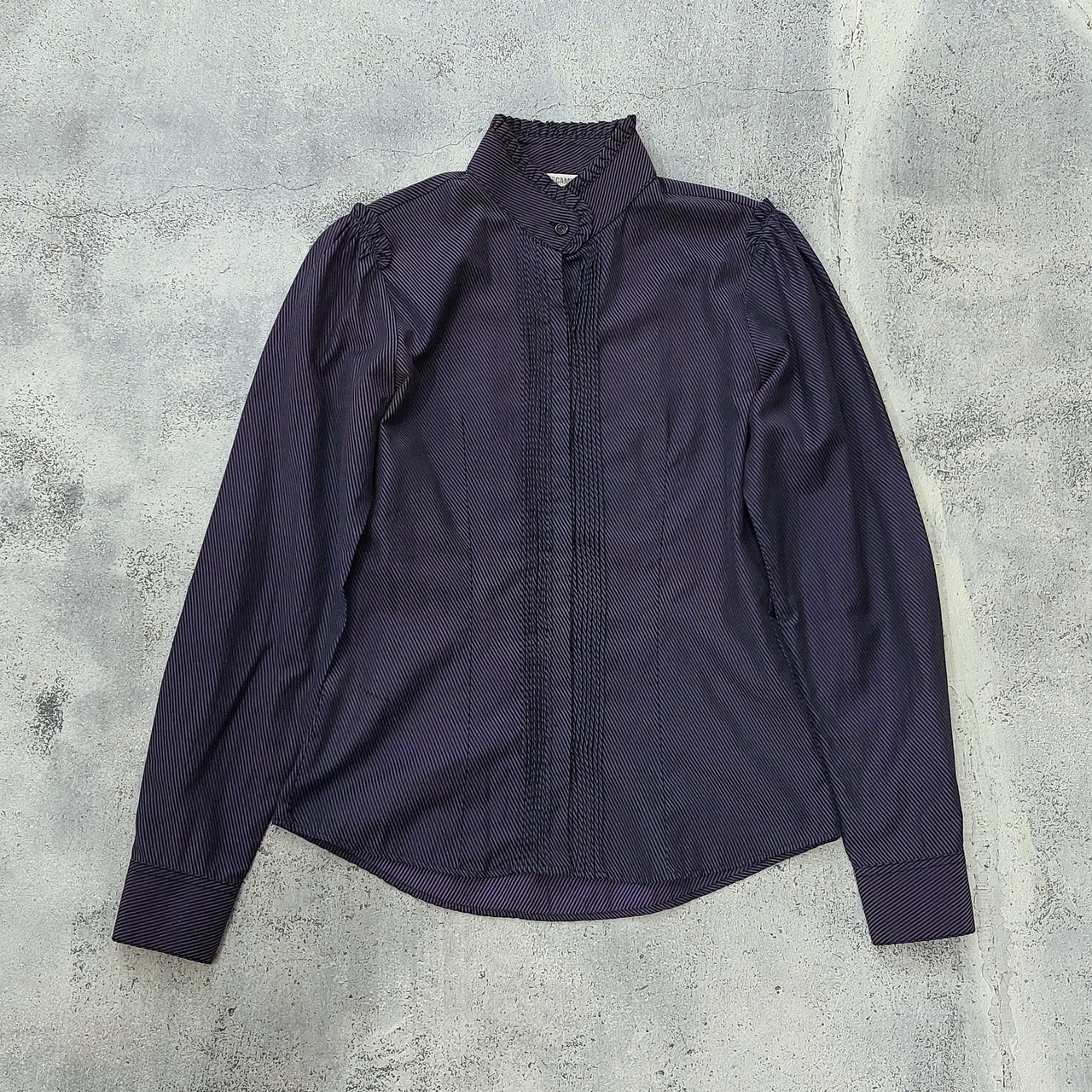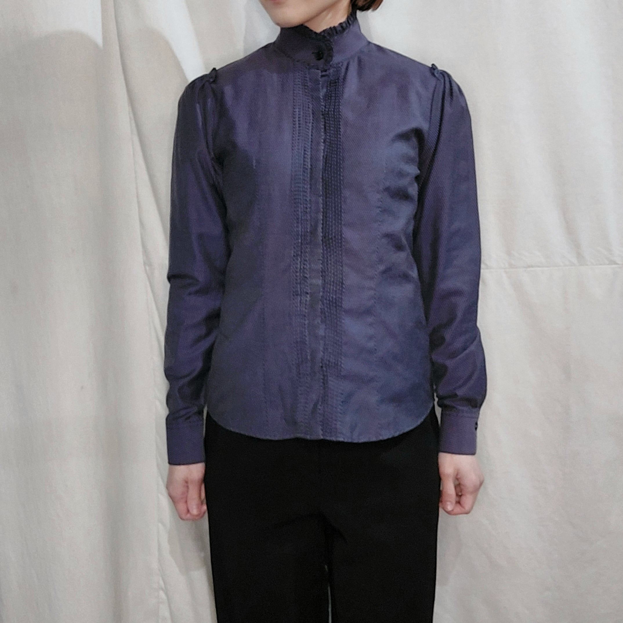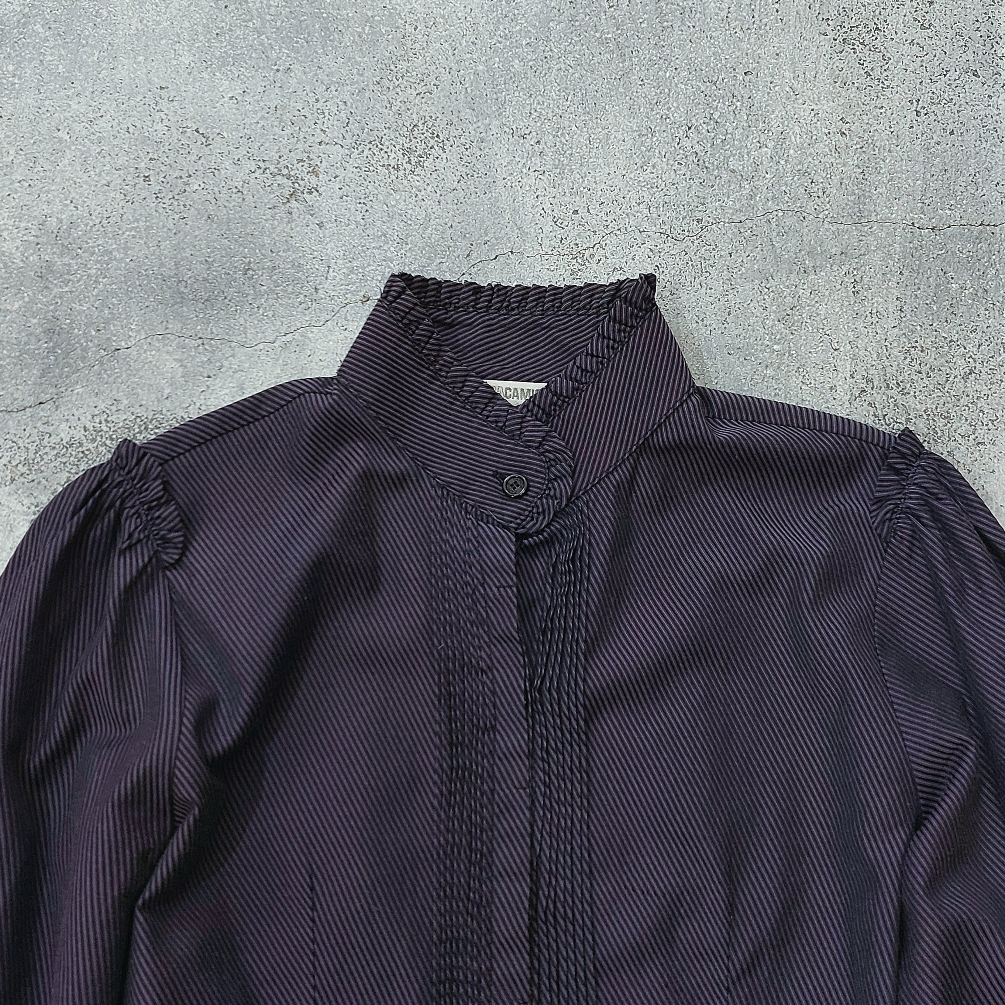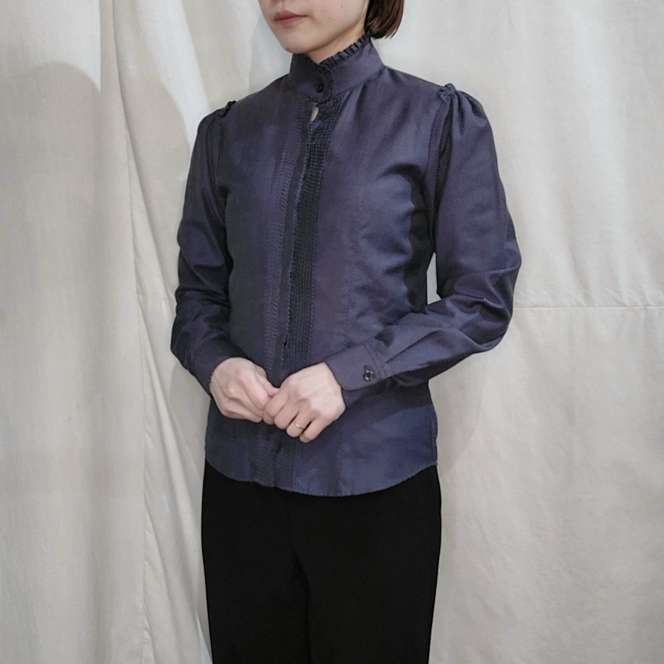 ルーマニア製NARACAMICIEのピンストライプフリルスタンドカラーブラウスです。
