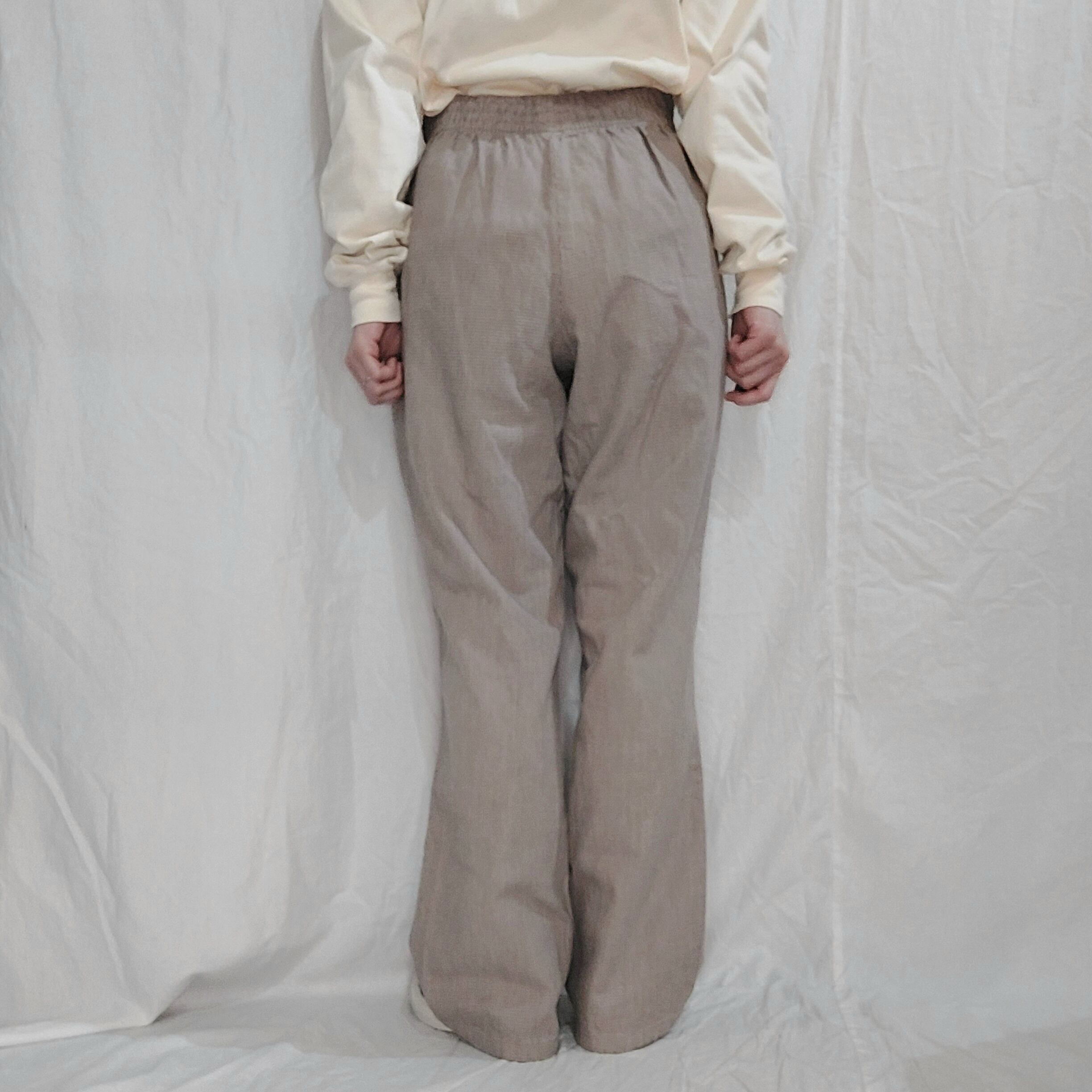 実寸サイズ(平置き):ウエスト(ゴム)68cm~78㎝程度×股上32cm×股下70.5cm×すそ幅21cm×わたり33.5cm