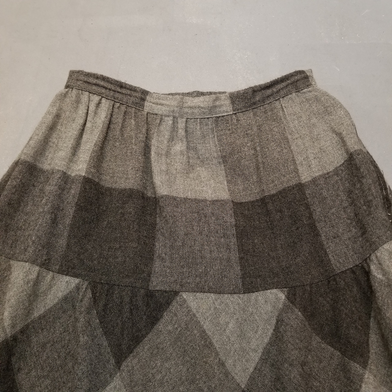 シックなグレーで大人な雰囲気がありつつも、大きな柄のチェックだったり、切り替えの二段目がバイアスになっていたりと目を惹くポイントもあります。