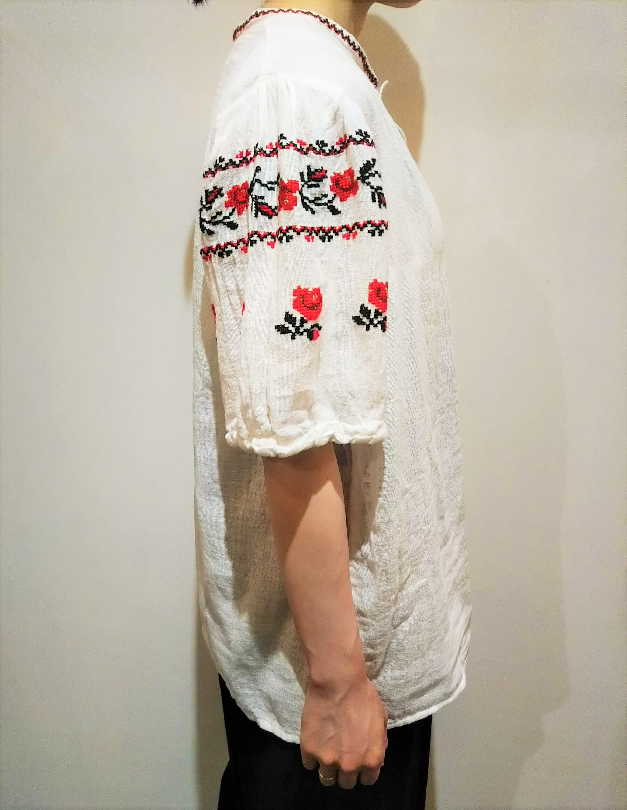 朱色の刺繍が目を惹くブラウスです。
