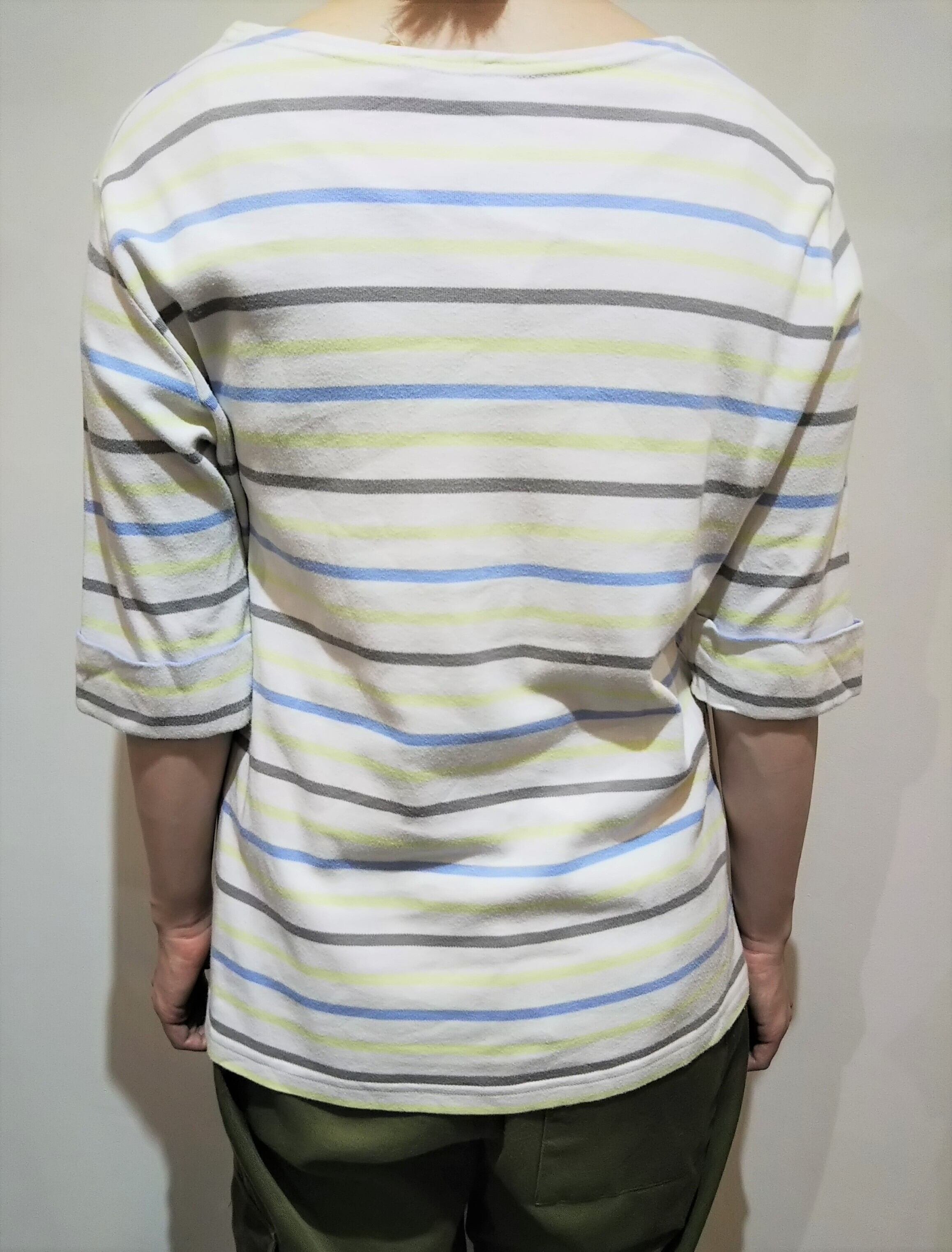 珍しい配色で、色が分かりづらいですが黄緑とサックスブルー、グレーのボーダーです。