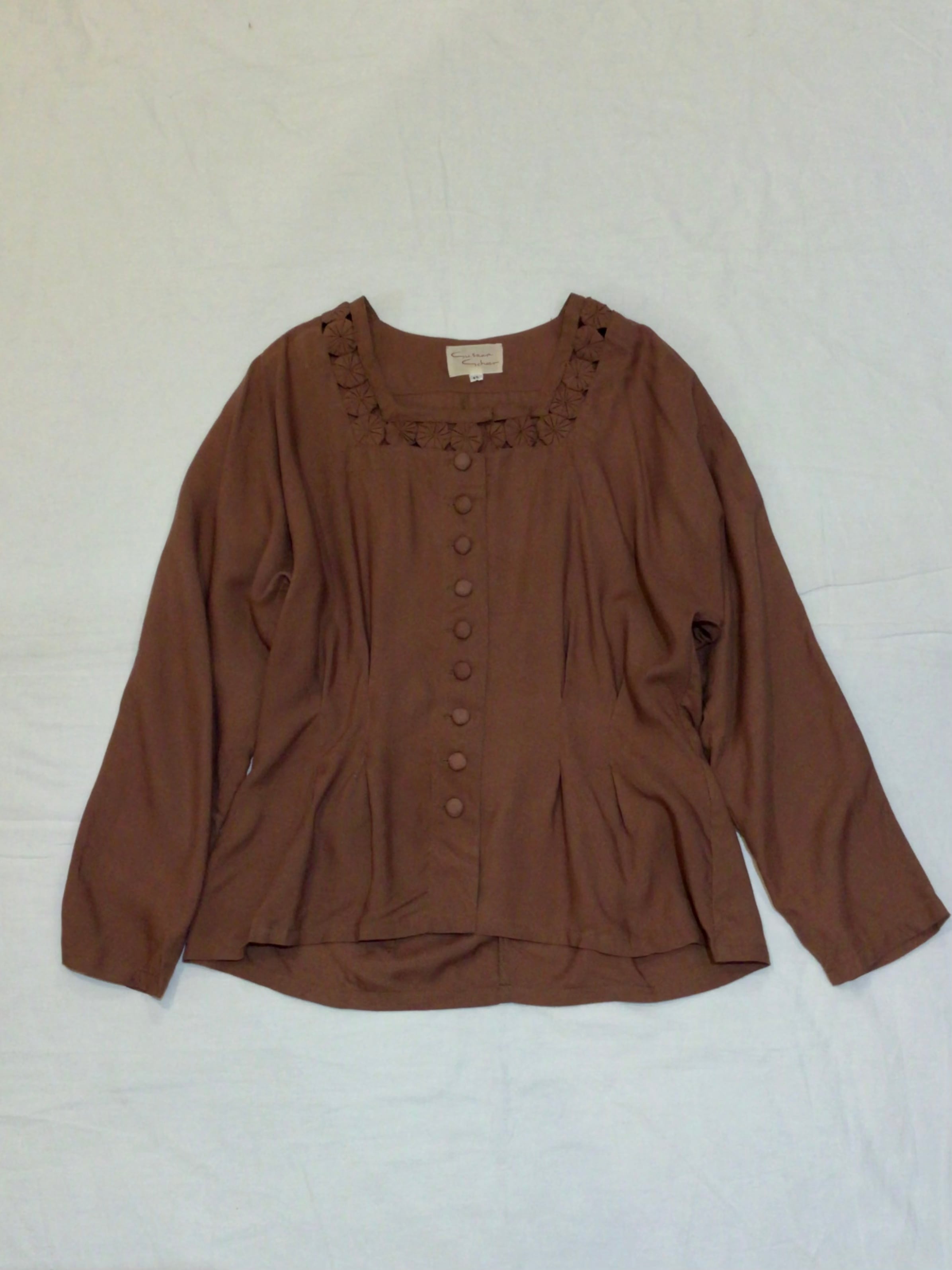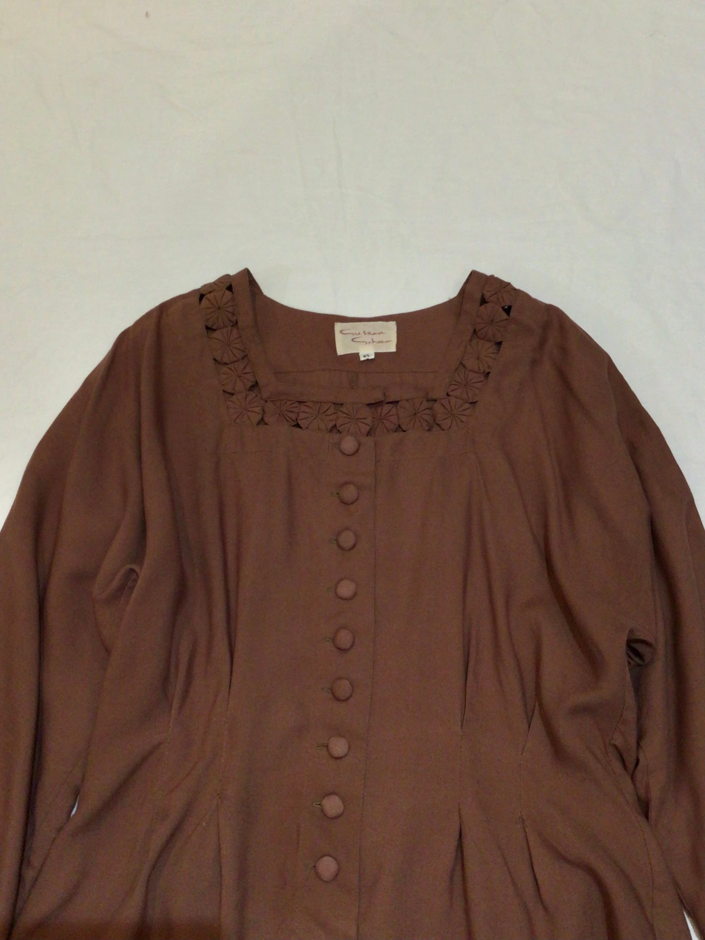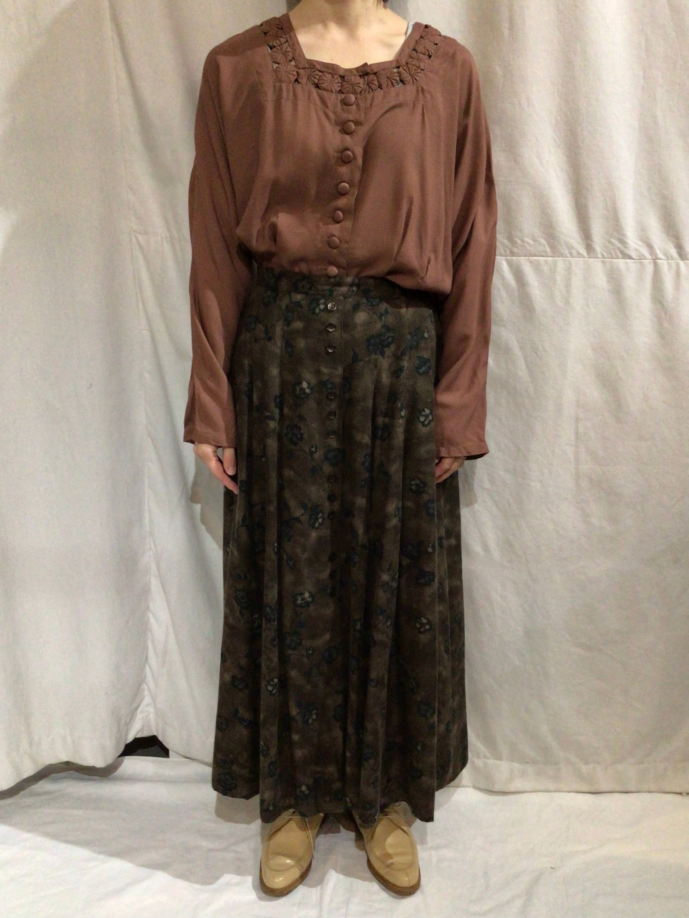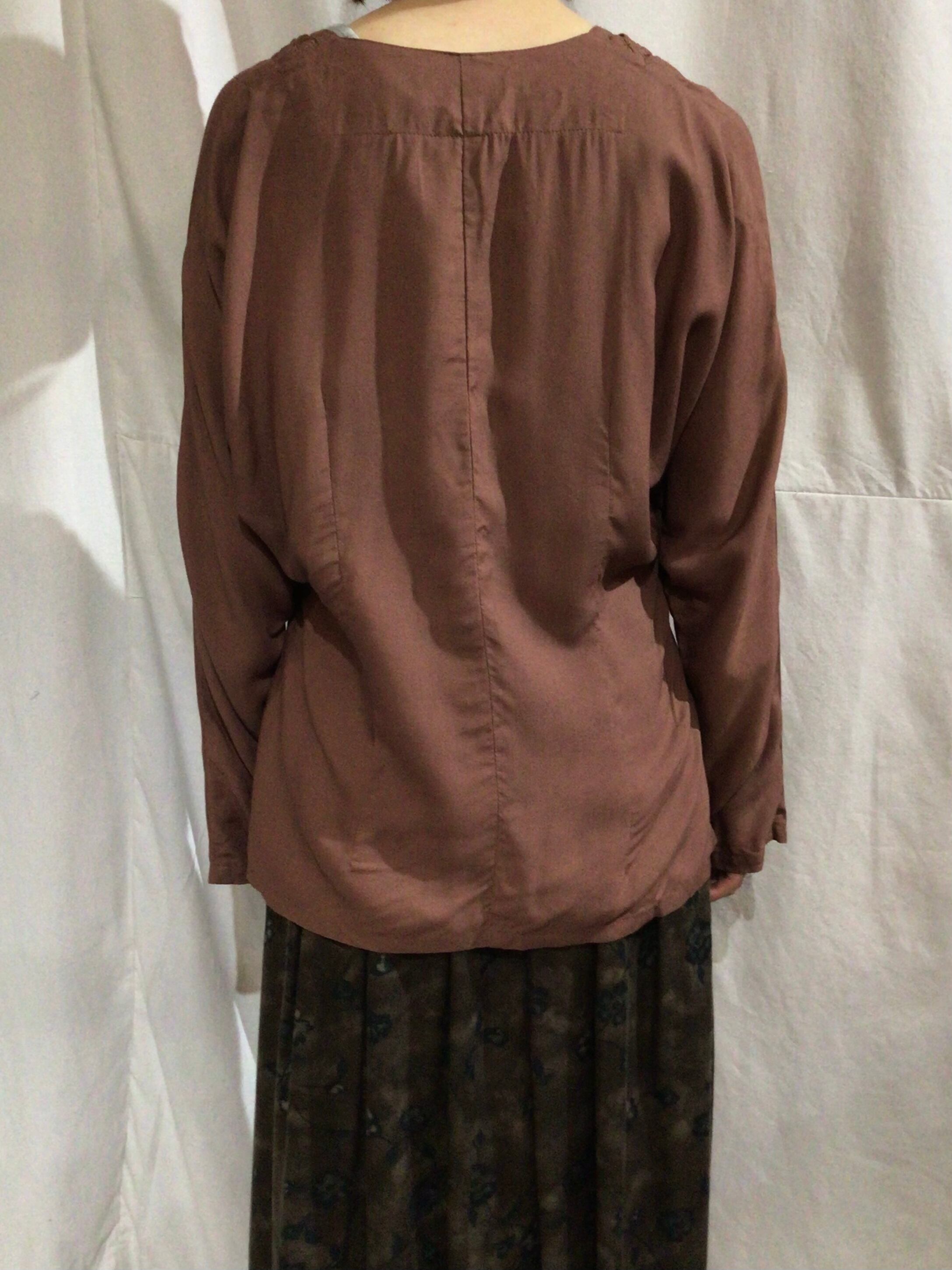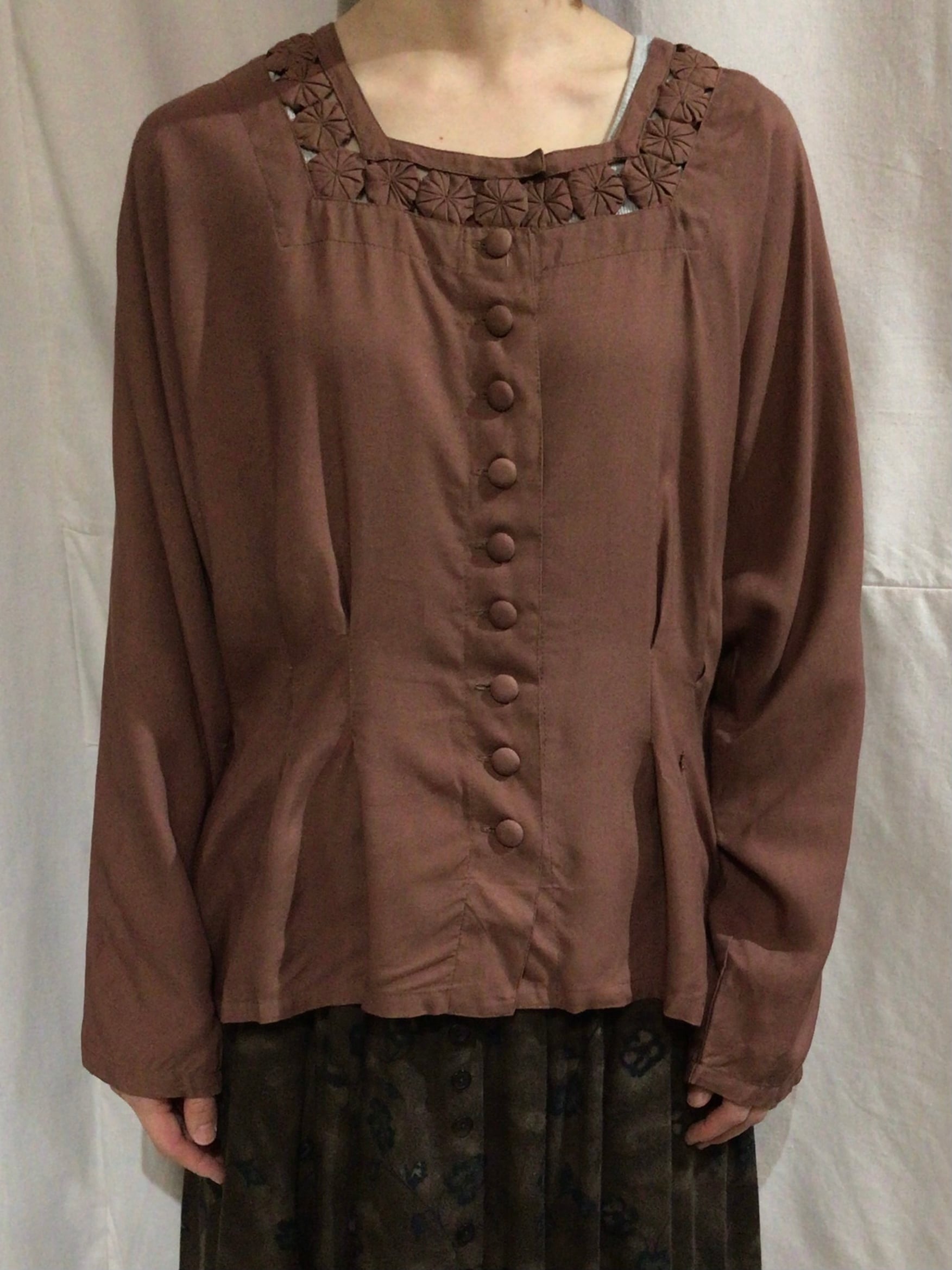 ドイツ買い付けのヨーヨーキルトが首回りにデザインされたレーヨンブラウスです。