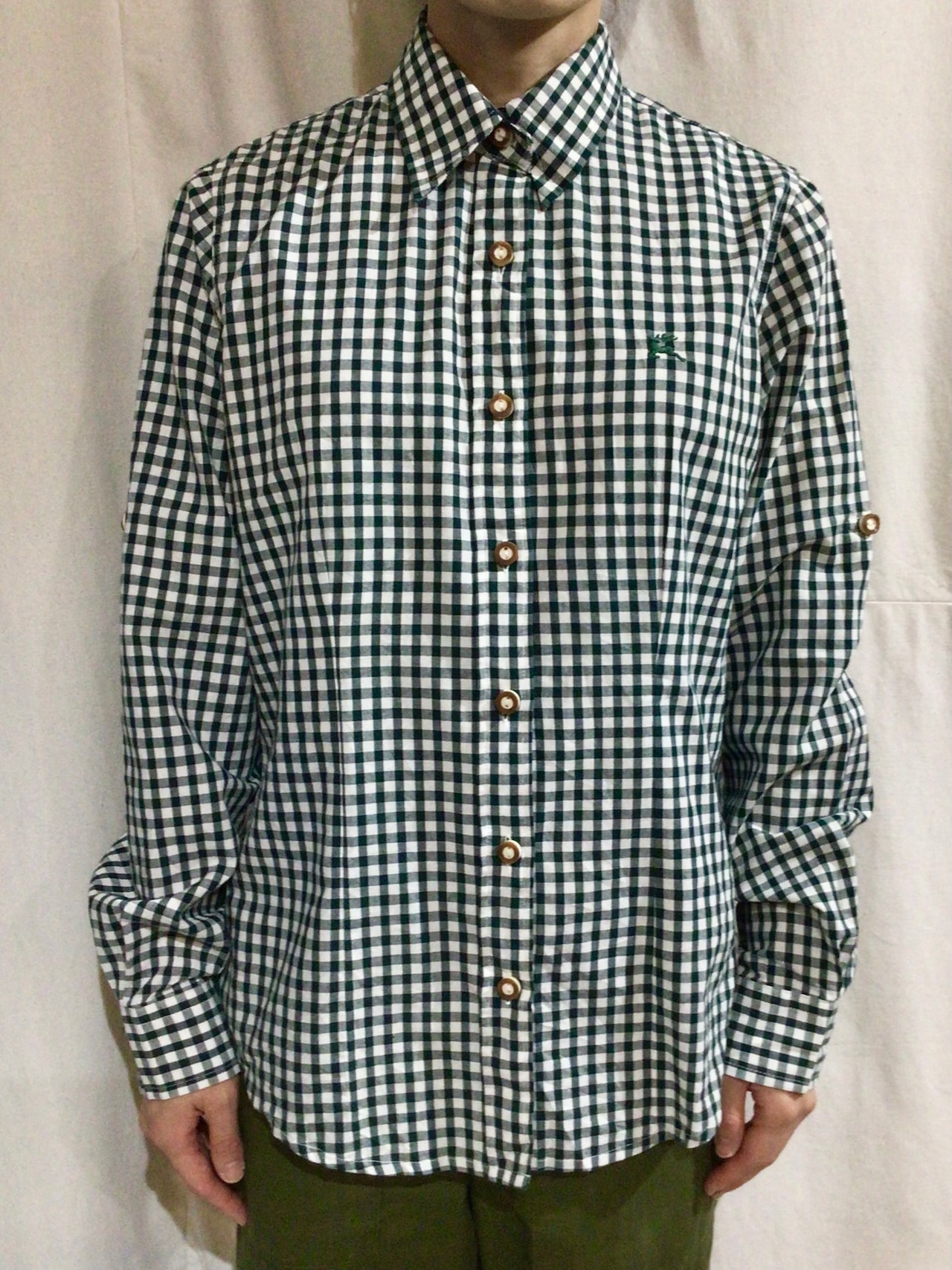 胸にトナカイの刺繍がポイントになったギンガムチェックチロルシャツです。