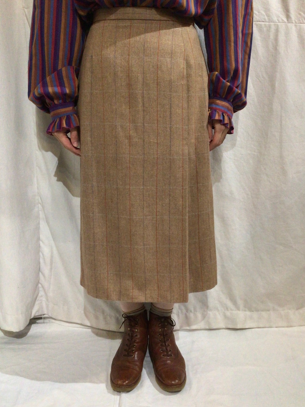 ヘリンボーンにチェック柄が重なったクラシカルなタイトスカートです。