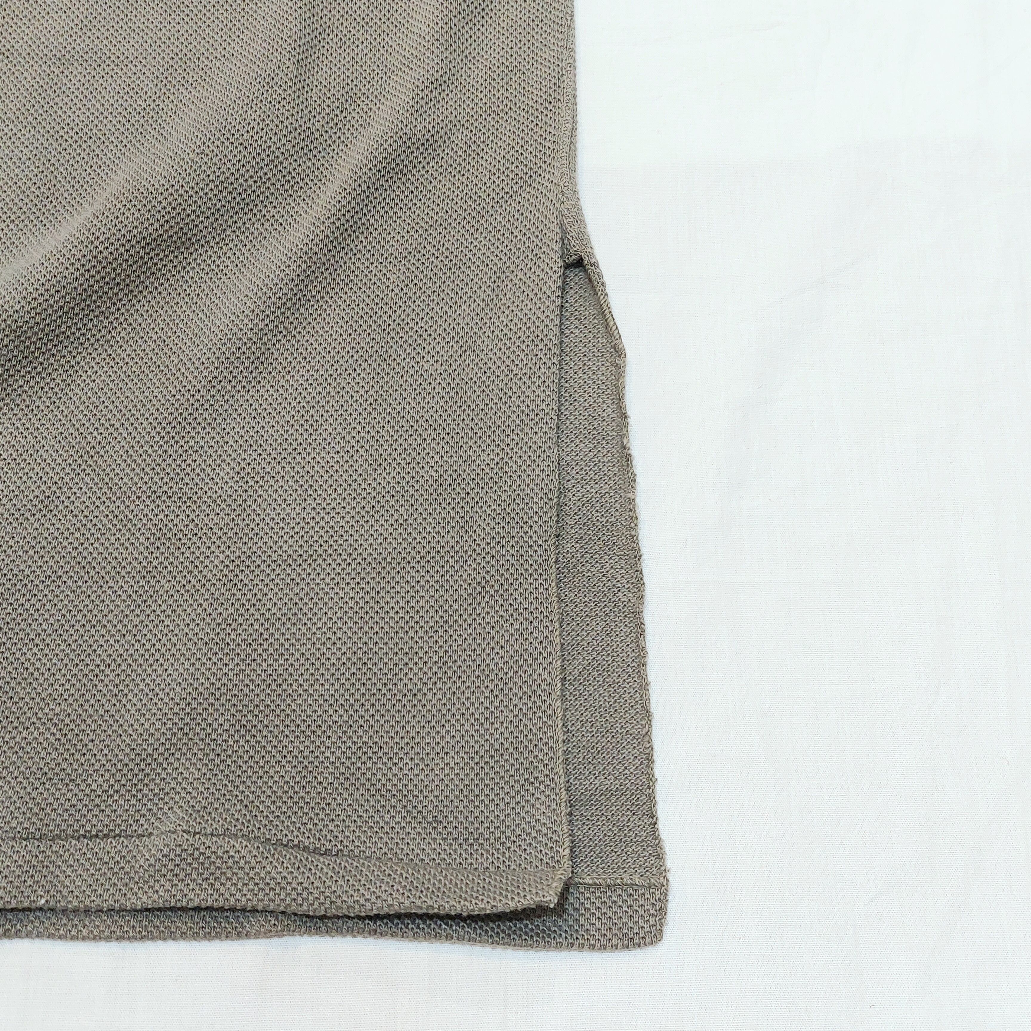 身頃は凹凸のあるワッフルカットソー素材で、襟、前立て、カフスは伸びないように布帛で切り替えられています。