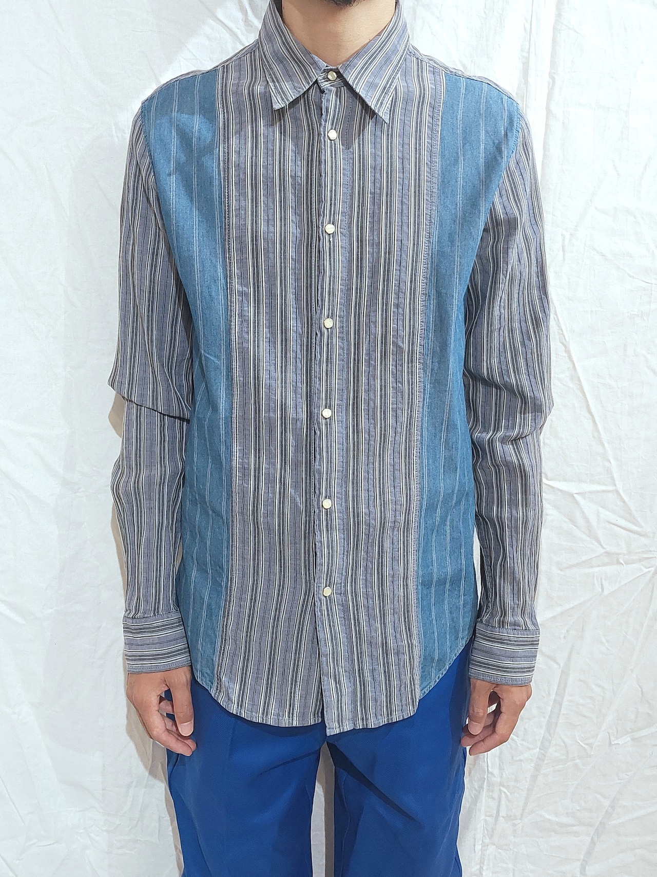 シャンブレーと凹凸感のある生地の切り替えになっており、ウェスタンシャツのようなスナップボタンが使われています。