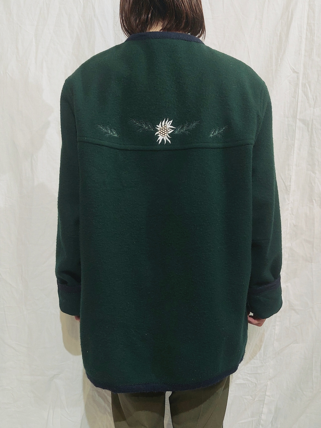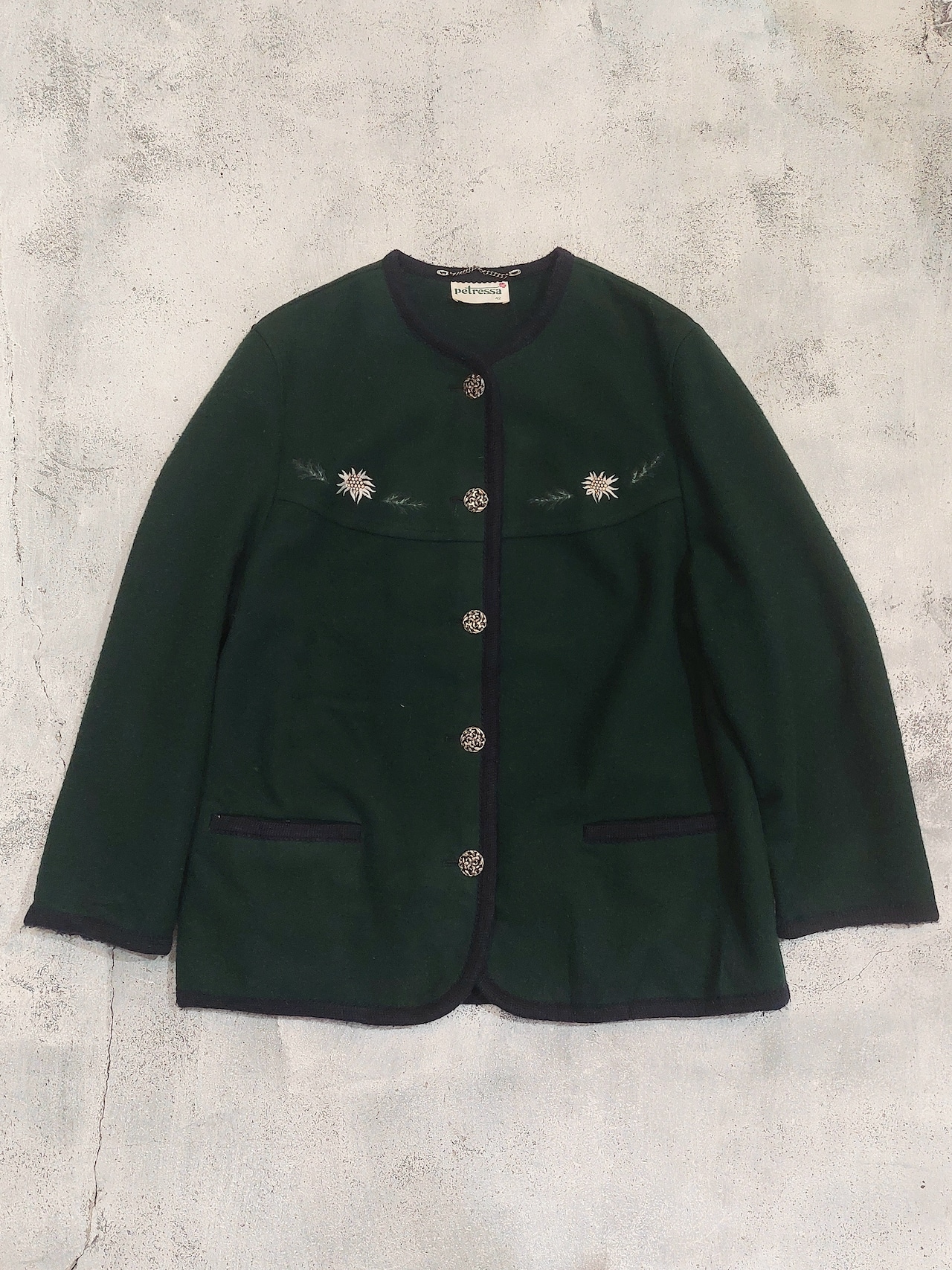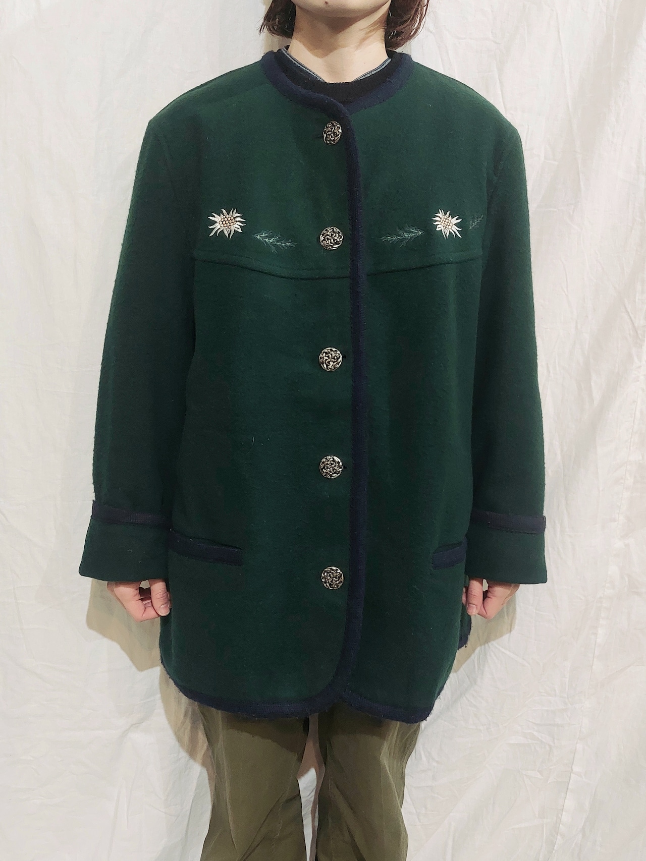 刺繍が可愛らしい、ノーカラーチロルジャケットです。