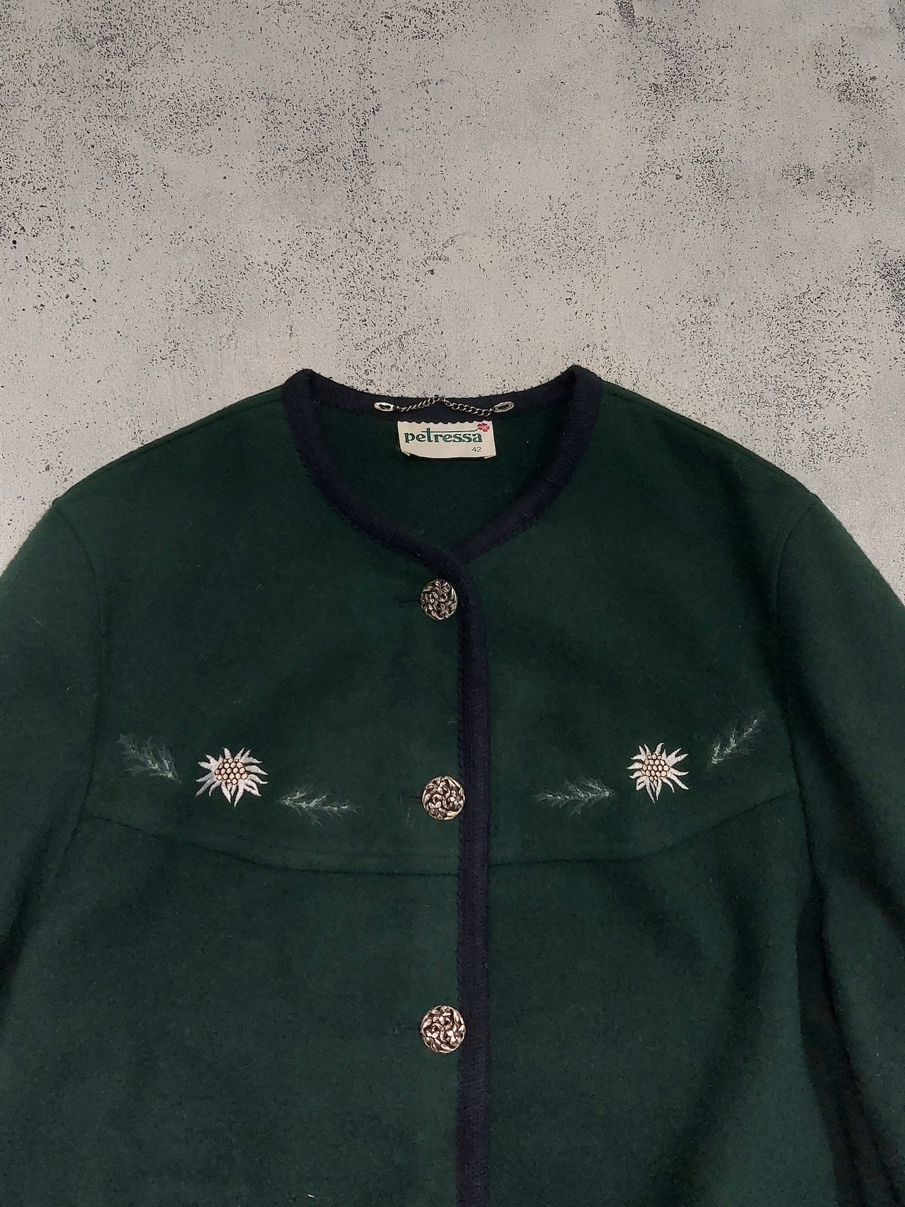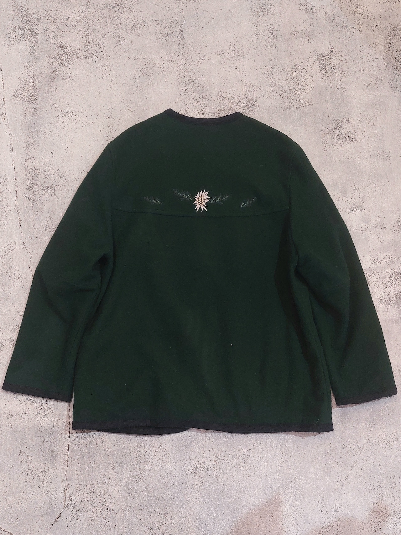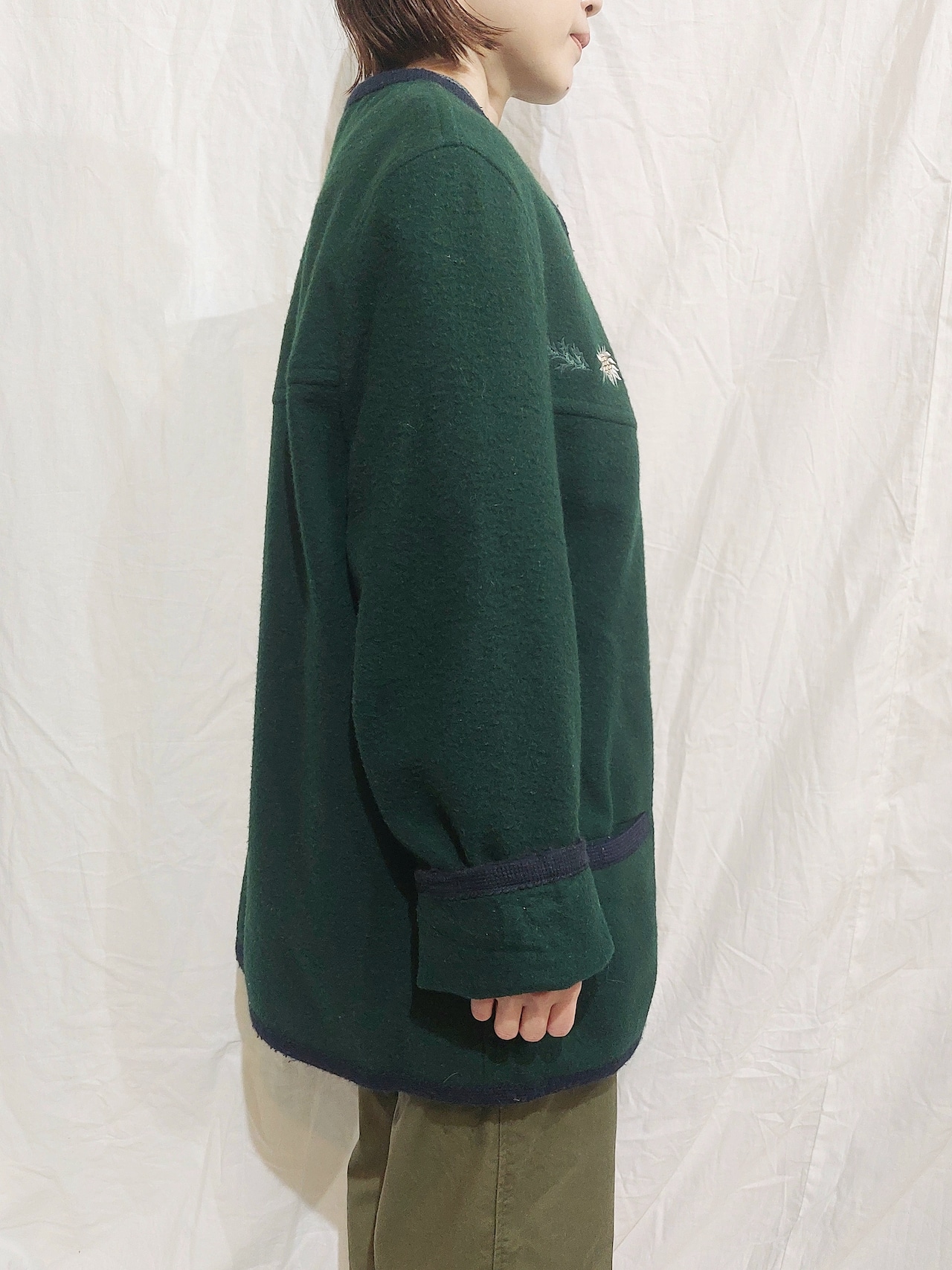 刺繍が可愛らしい、ノーカラーチロルジャケットです。