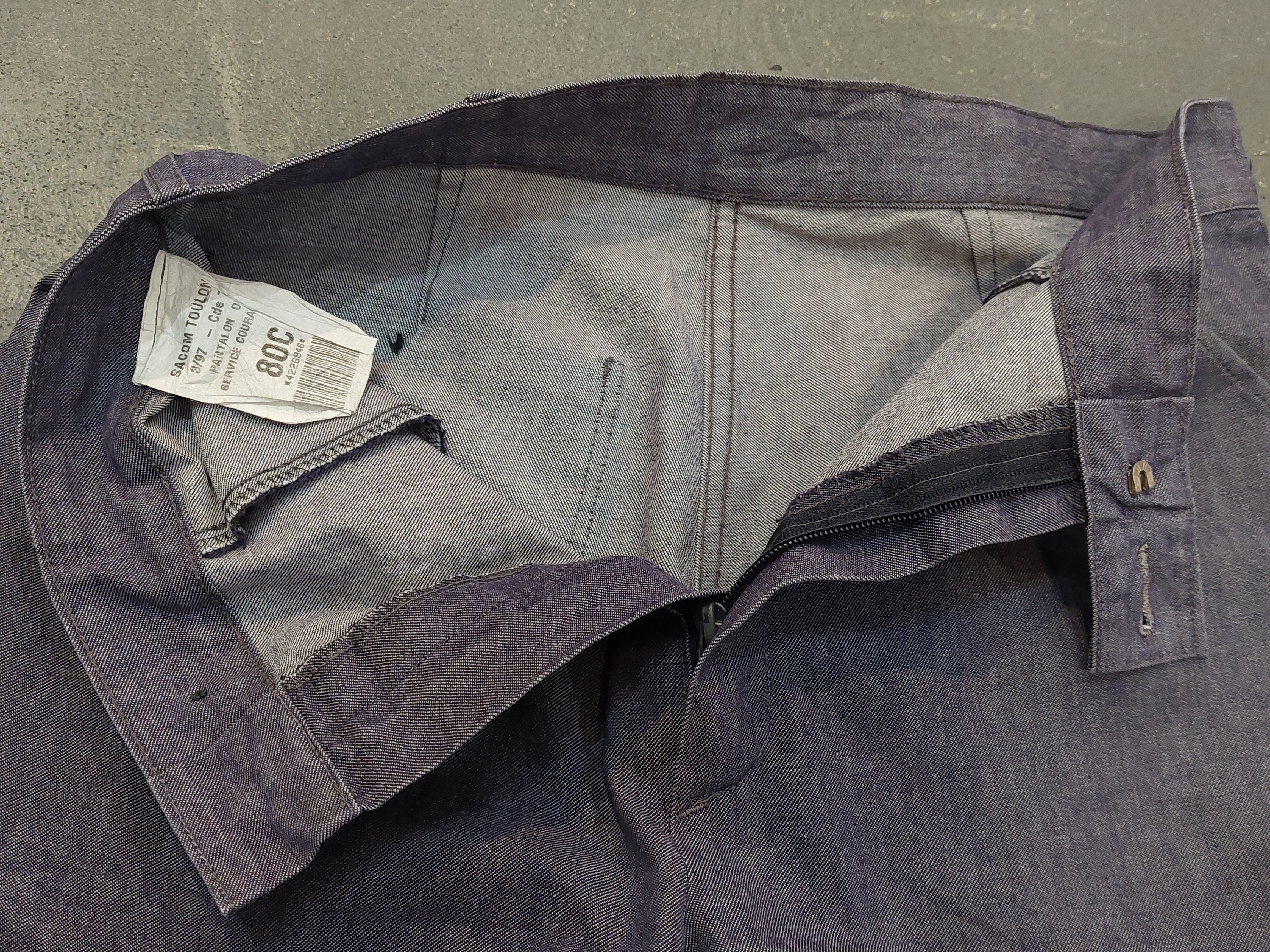 状態:後ろポケットのボタン欠損、ベルトループのほつれ、左脇に小さな穴、所々色落ちや擦れ、汚れがあります。