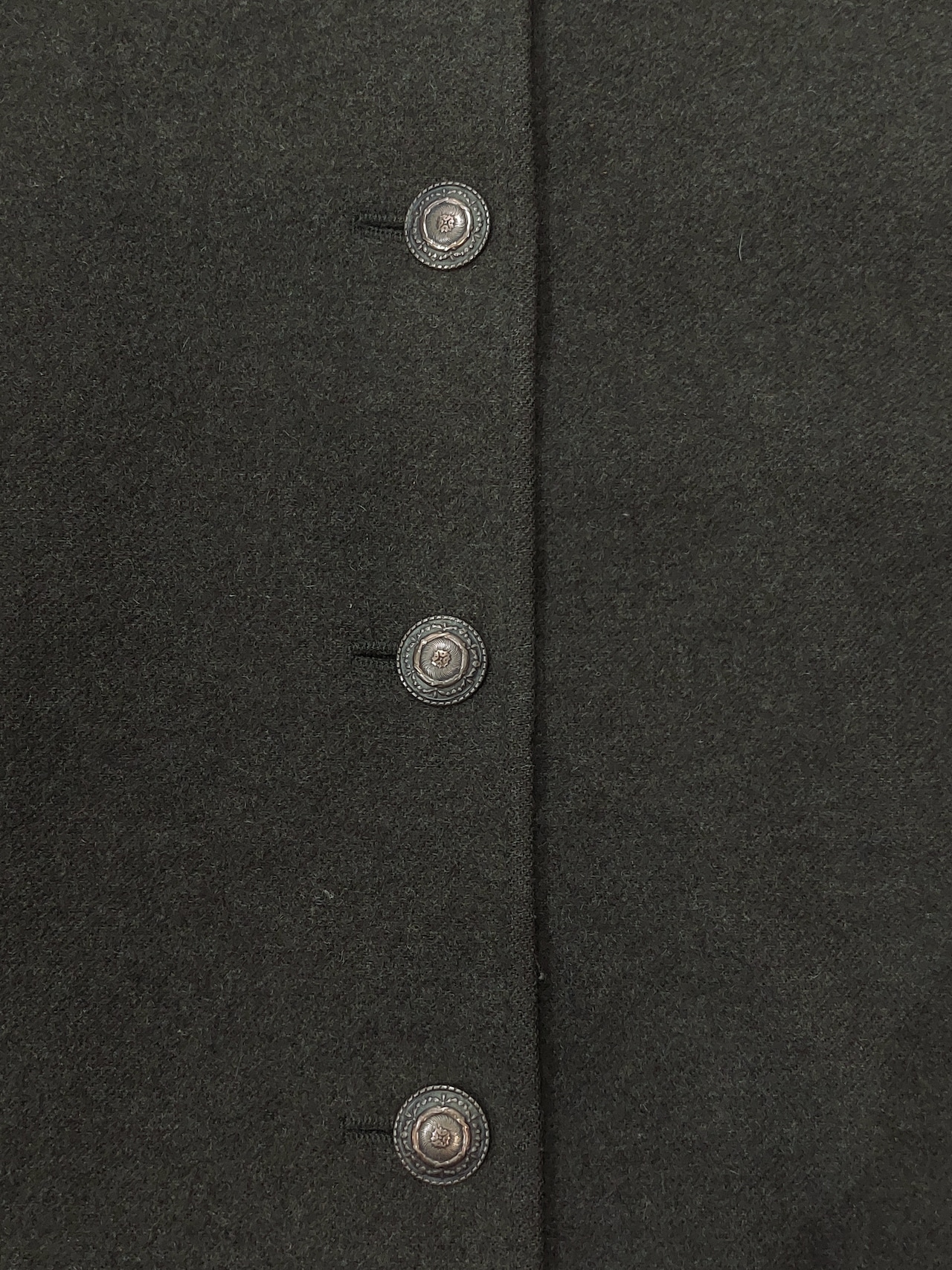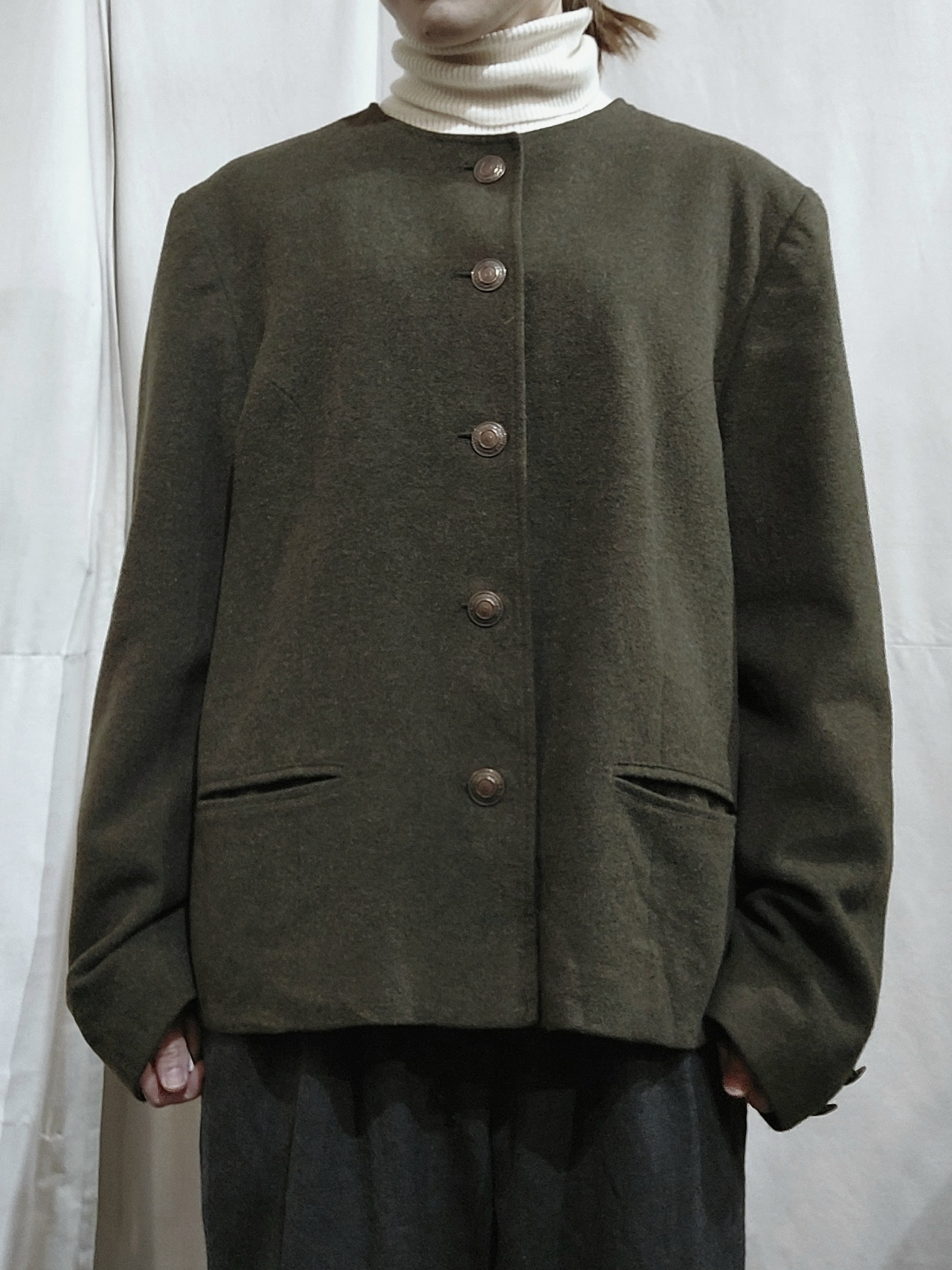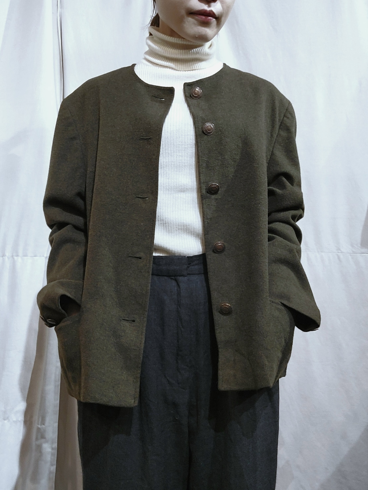 シンプルなデザインにボタンがアクセントになったノーカラーウールジャケットです。