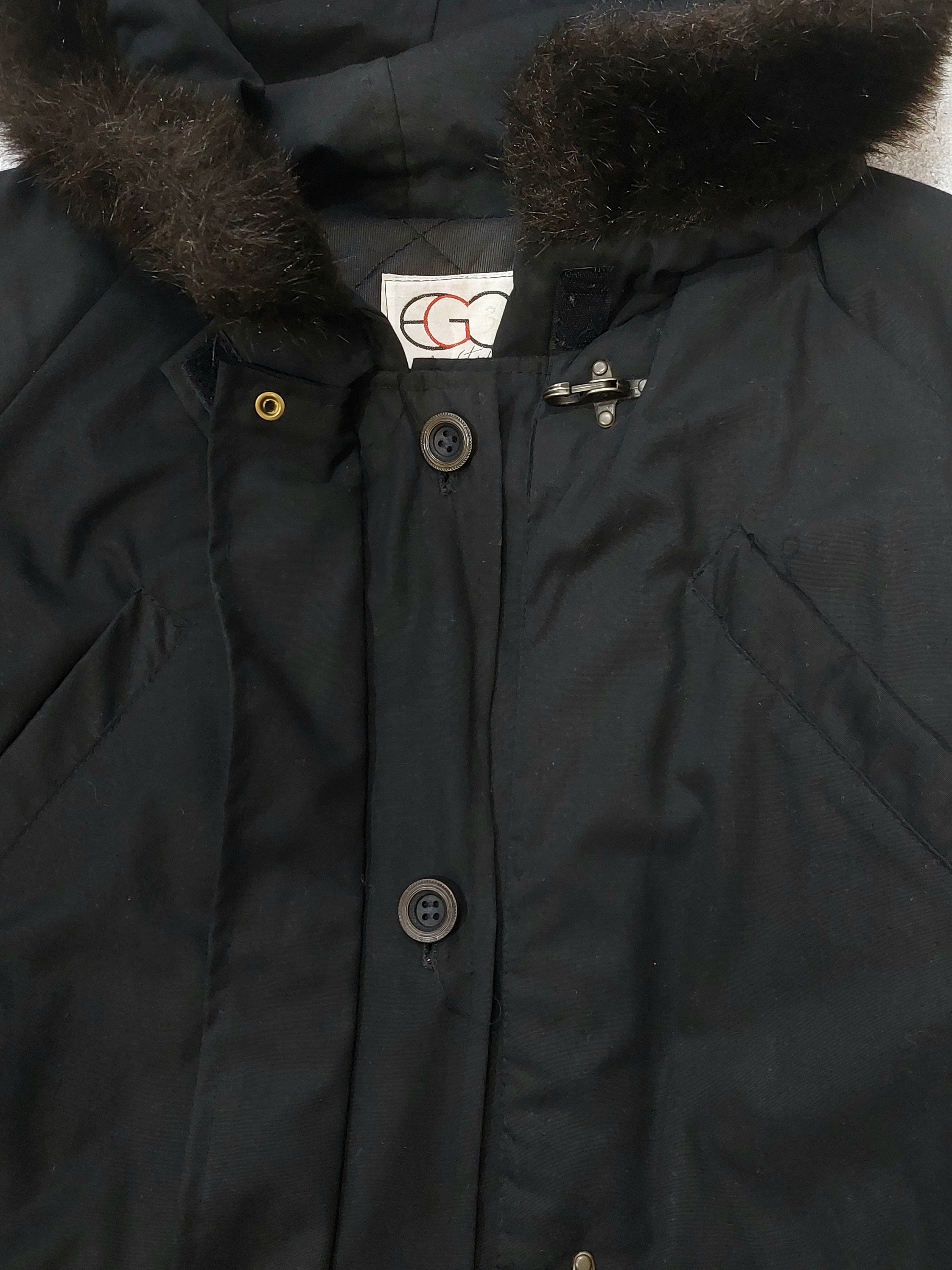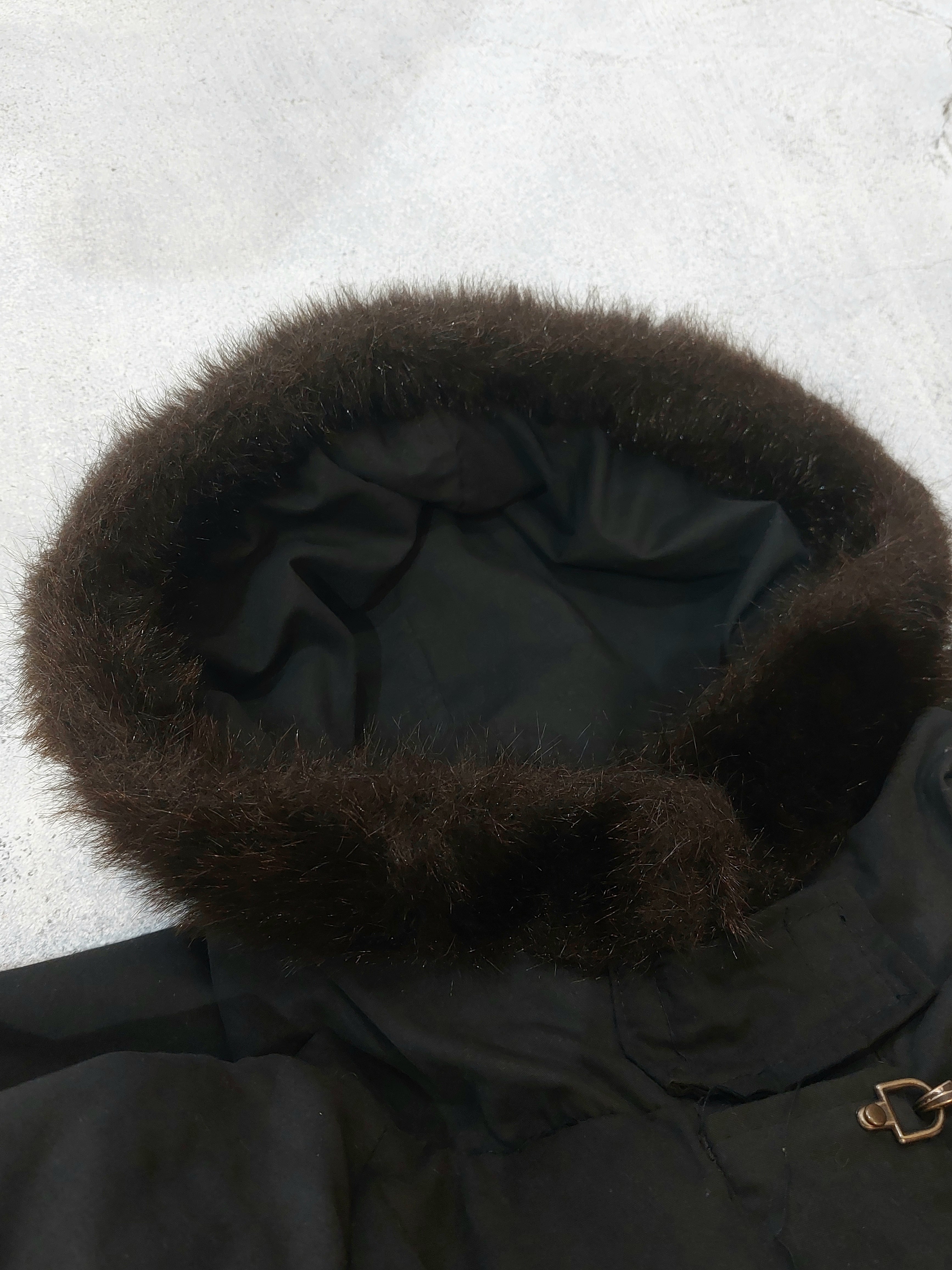 ファーがついたフード付きのキルティングコートです。ファーは取り外せません。
